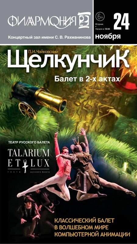 Театр русского балета «Talarium et Lux» представляет на сцене Концертного зала имени С. В. Рахманинова «Филармонии-2» балет «Щелкунчик»! Откройте для себя неповторимый мир балетного театра в необычном оформлении. Изюминкой представления являются потрясающие мультимедийные декорации 3D: это уникальная технология представлена в России только в театре русского балета Talarium et Lux. Ваши малыши получат незабываемые впечатления от этого яркого сказочного действа.