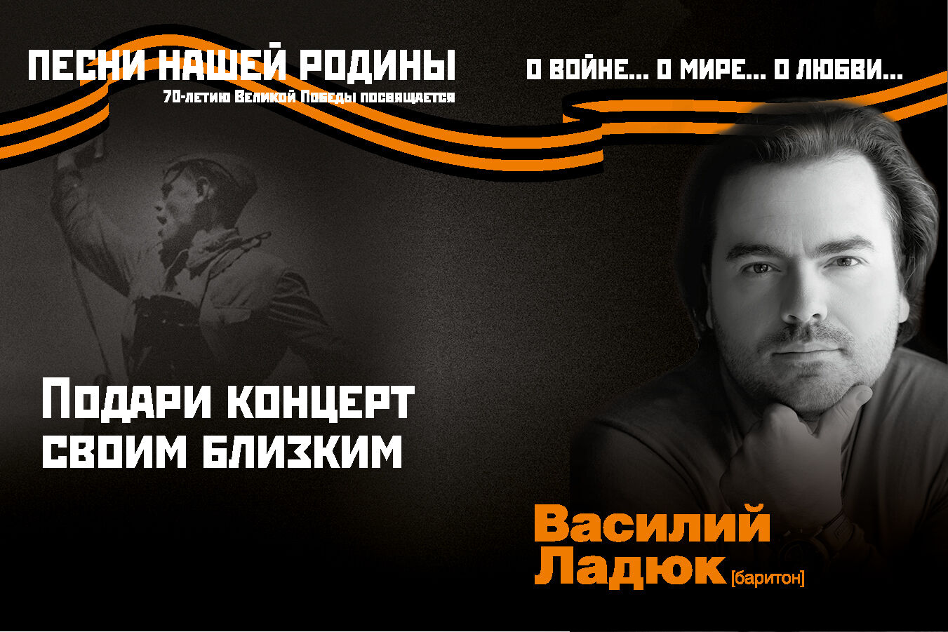 Проект Московской филармонии «Песни нашей Родины. О войне... о мире... о любви...» адресован, в первую очередь, нашим дорогим ветеранам и всем тем, кто пережил страшное испытание — Великую Отечественную войну. Для них эти песни были настоящей отдушиной, поднимали боевой дух и укрепляли волю к победе, хранили и самые радостные, и самые горькие переживания трудных военных и послевоенных лет. «Жди меня и я вернусь», «Вот солдаты идут», «На безымянной высоте», «Журавли», «День победы»… Каждое название – история страны и судьба человека. А проживать их вновь и вновь мы будем вместе с великолепным певцом и большим актером Василием Ладюком.