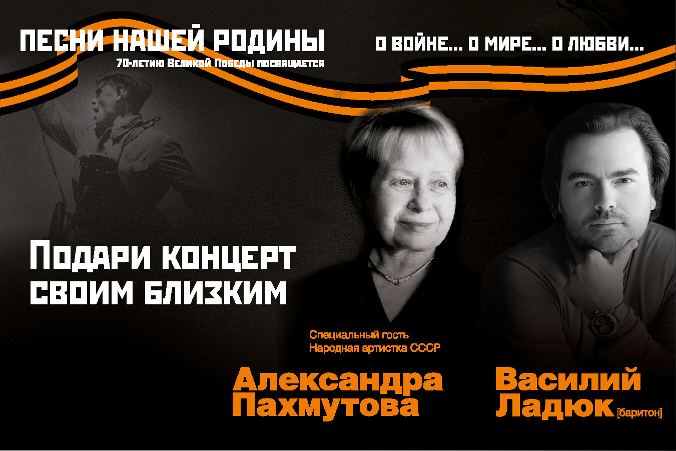 Проект Московской филармонии «Песни нашей Родины. О войне... о мире... о любви...» адресован, в первую очередь, нашим дорогим ветеранам и всем тем, кто пережил страшное испытание — Великую Отечественную войну. Для них эти песни были настоящей отдушиной, поднимали боевой дух и укрепляли волю к победе, хранили и самые радостные, и самые горькие переживания трудных военных и послевоенных лет. «Жди меня и я вернусь», «Вот солдаты идут», «На безымянной высоте», «Журавли», «День победы»… Каждое название – история страны и судьба человека. А проживать их вновь и вновь мы будем вместе с великолепным певцом и большим актером Василием Ладюком.