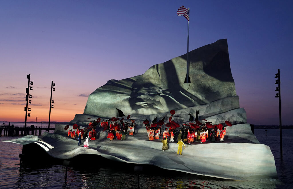 «Мадам Баттерфляй» Пуччини, одна из наиболее популярных опер, впервые исполняется на плавучей сцене Боденского озера. Дирижёр Энрике Маццола, уже известный зрителю по постановке «Риголетто», во главе Венского симфонического оркестра радует чарующим звучанием струнных и гибкостью, столь необходимой в Пуччини.
