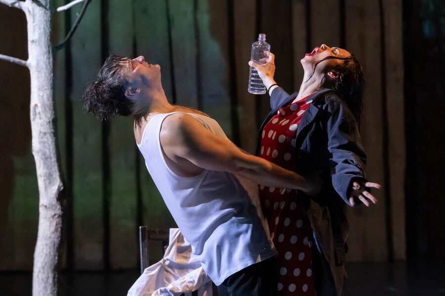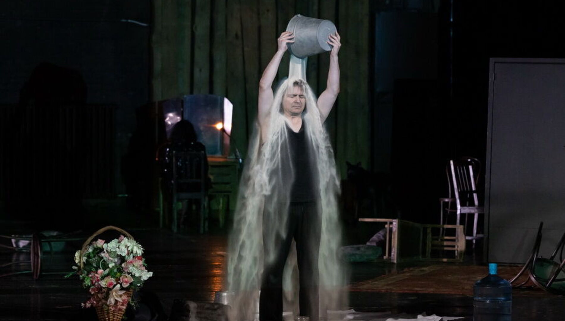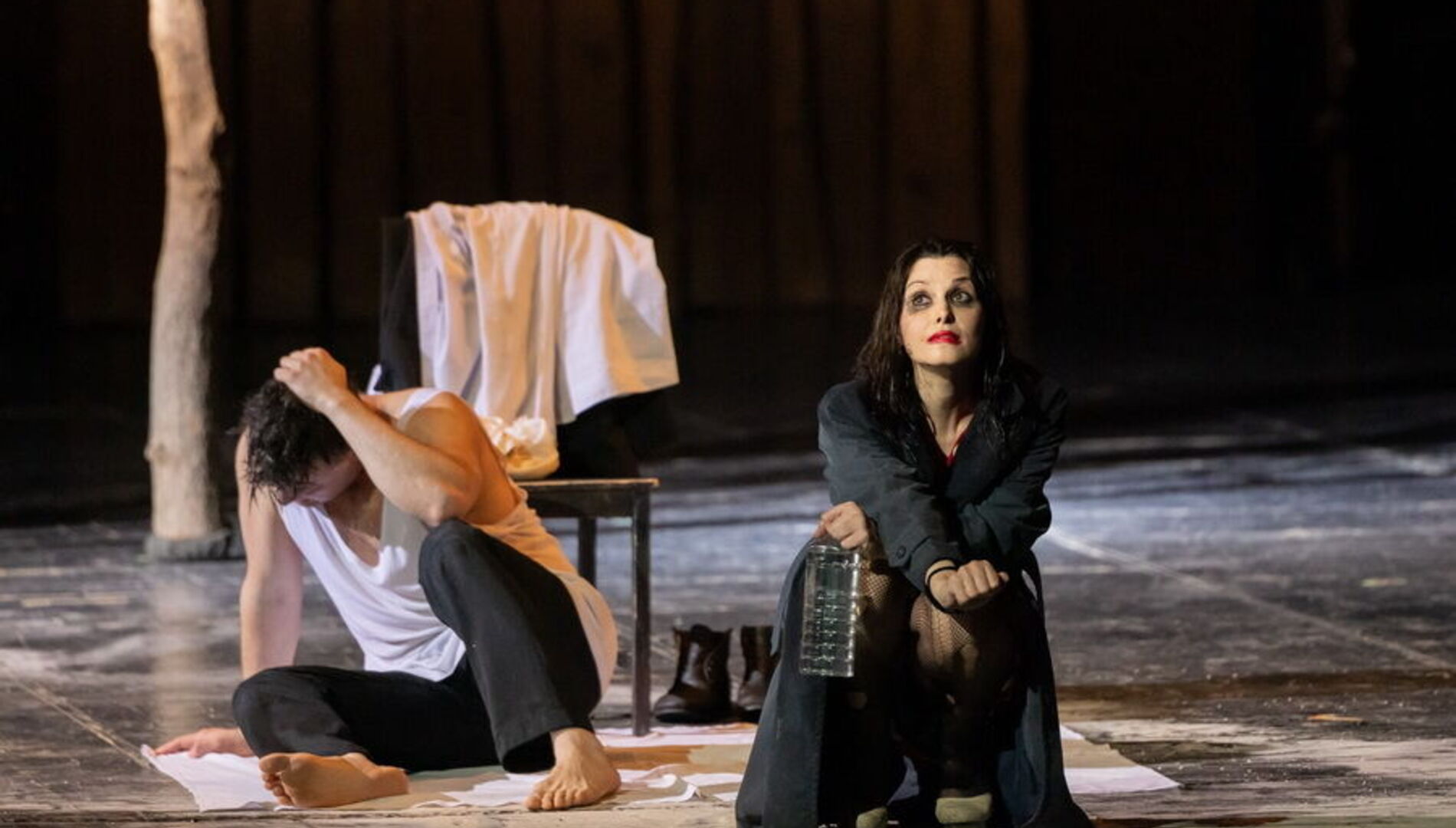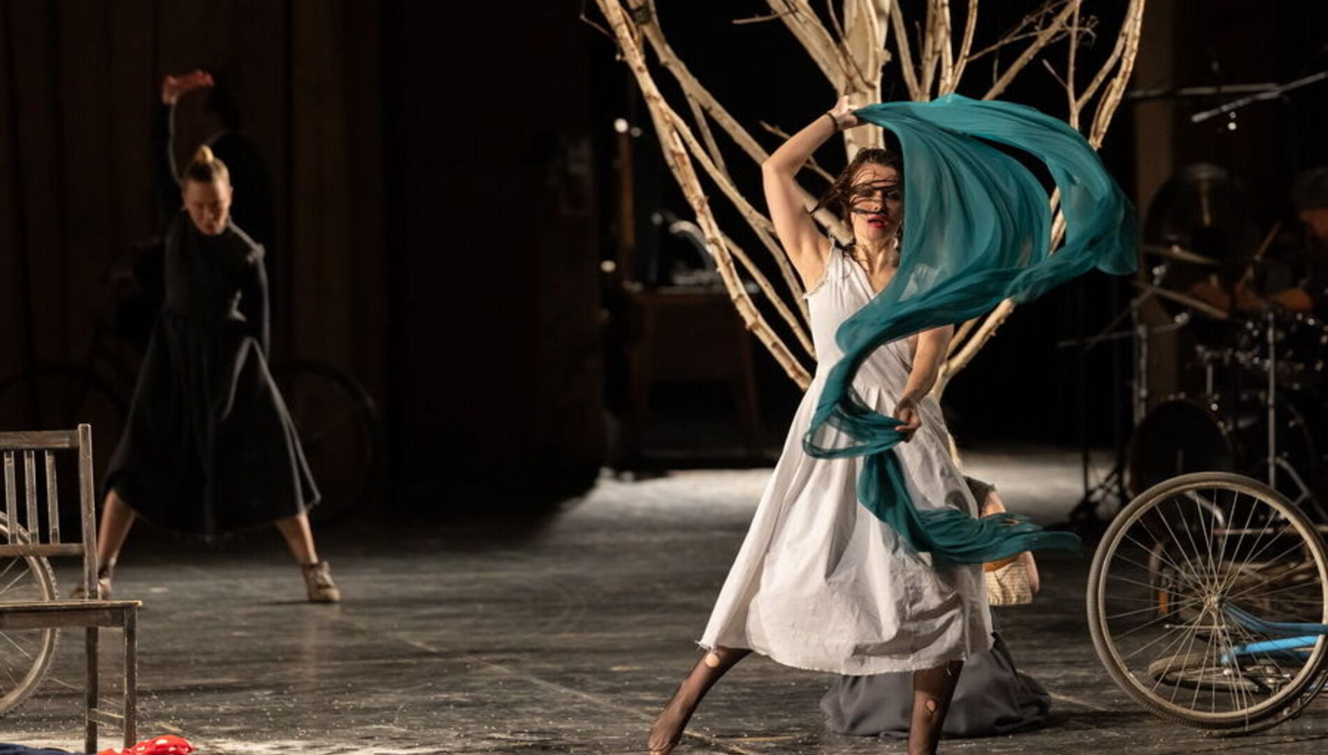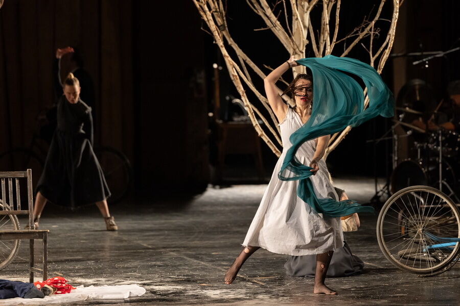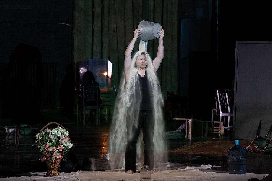 Спектакль лишён примет времени и места – это не китайский Сычуань, а просто богом заброшенная деревня на краю Вселенной, возможная в любой стране и в любом столетии, а может и в самом конце времён. Это подчеркивает сценографию Александра Шишкина, который оставил сцену практически голой, лишь завалив её приметами человеческого быта: брошенными велосипедами, никуда не ведущими дверями, стульями, ящиками и голыми бесприютными деревьями.