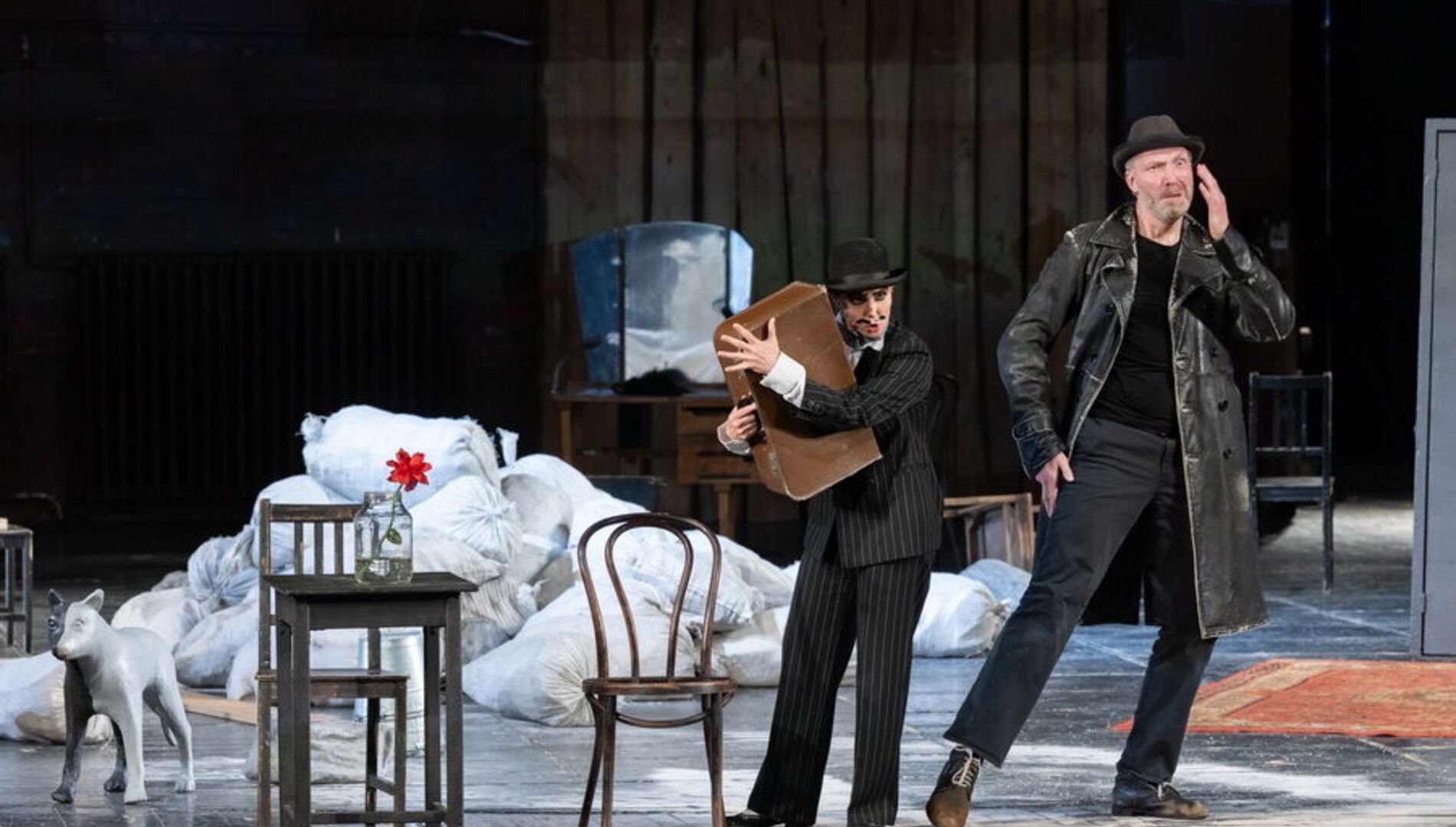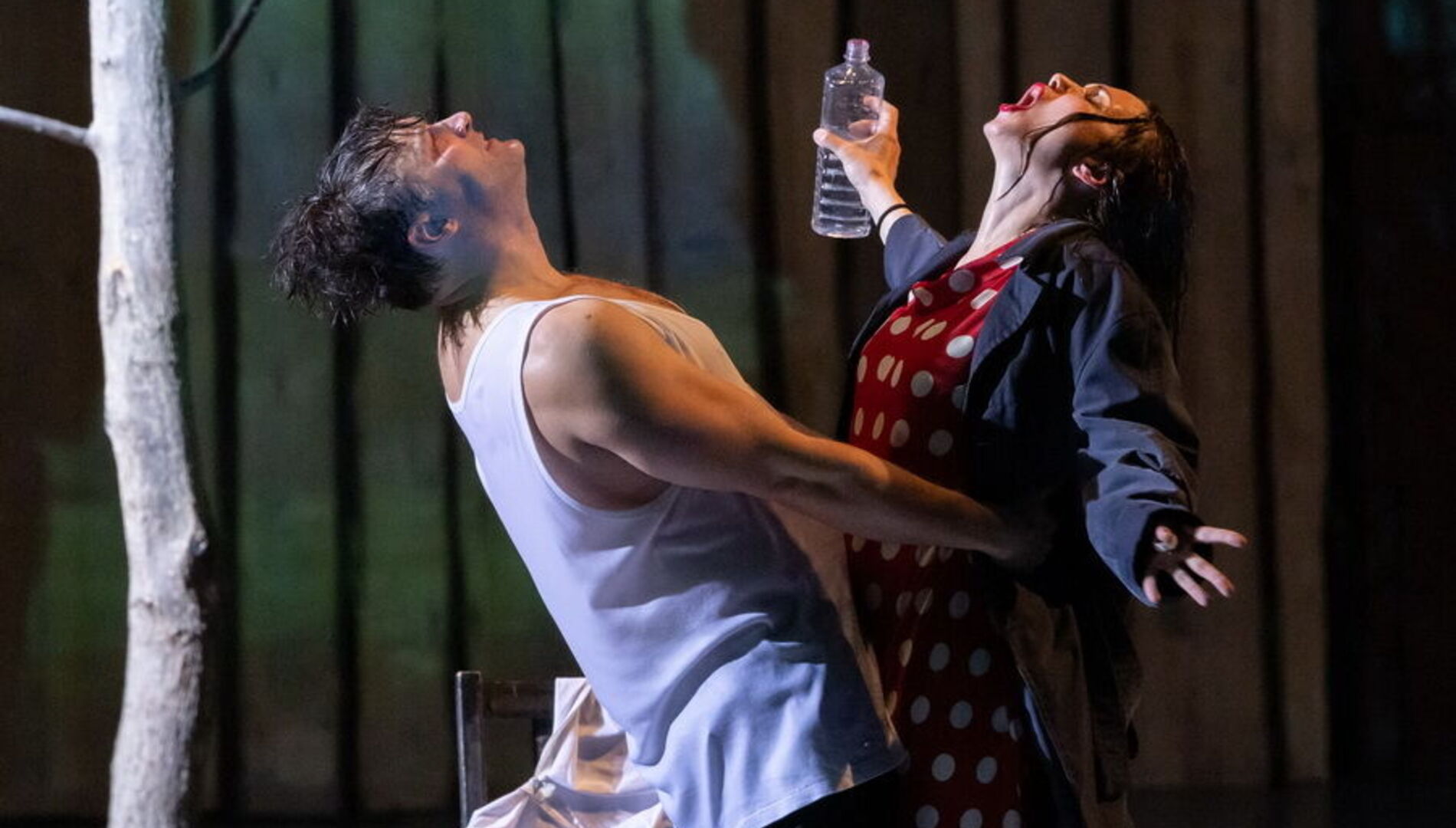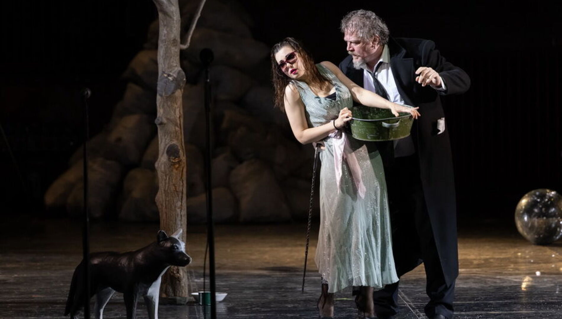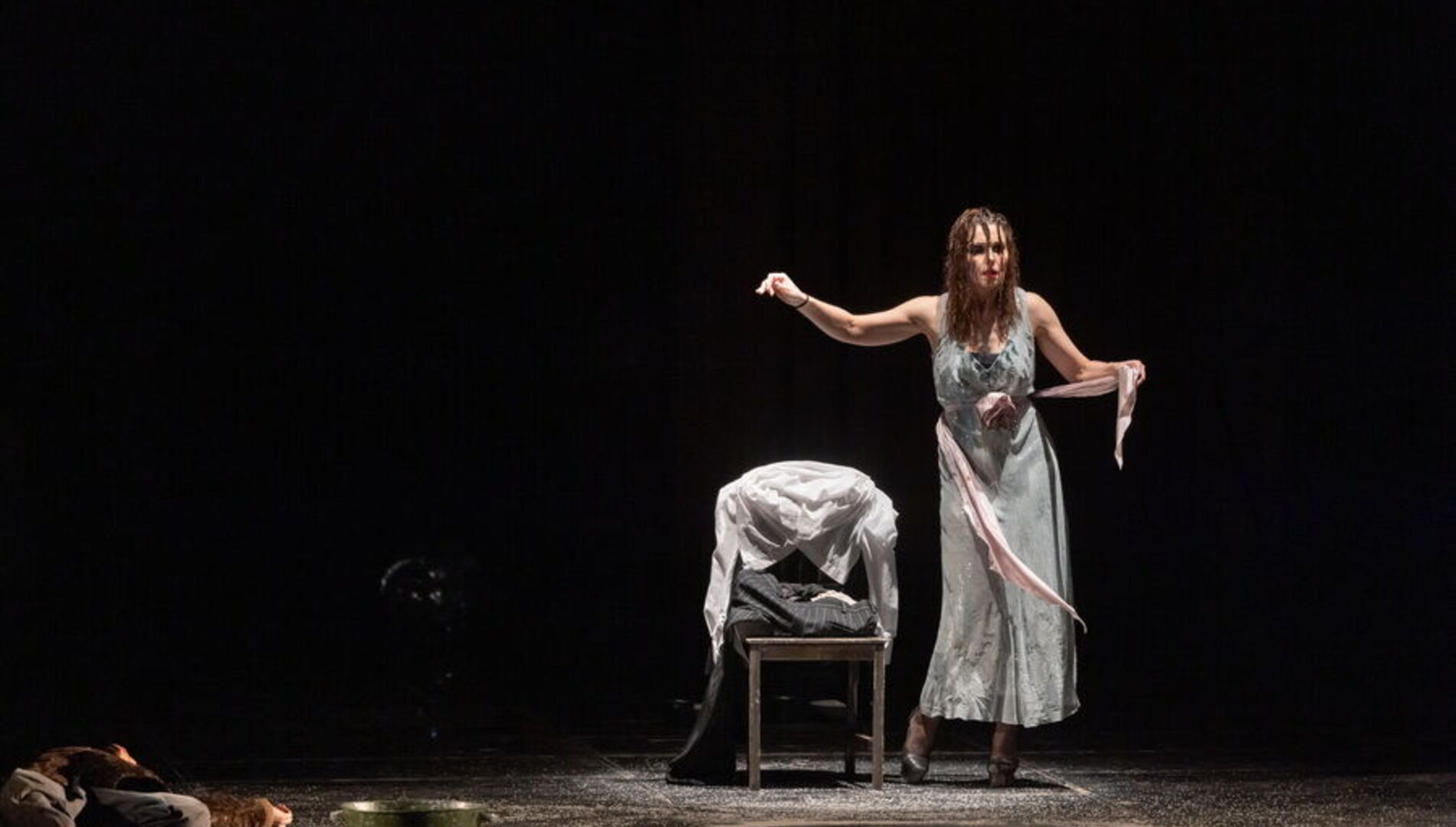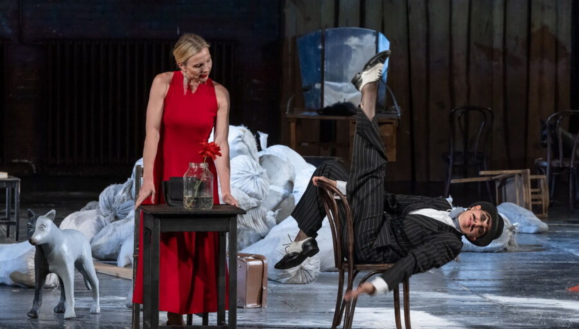 Спектакль лишён примет времени и места – это не китайский Сычуань, а просто богом заброшенная деревня на краю Вселенной, возможная в любой стране и в любом столетии, а может и в самом конце времён. Это подчеркивает сценографию Александра Шишкина, который оставил сцену практически голой, лишь завалив её приметами человеческого быта: брошенными велосипедами, никуда не ведущими дверями, стульями, ящиками и голыми бесприютными деревьями.